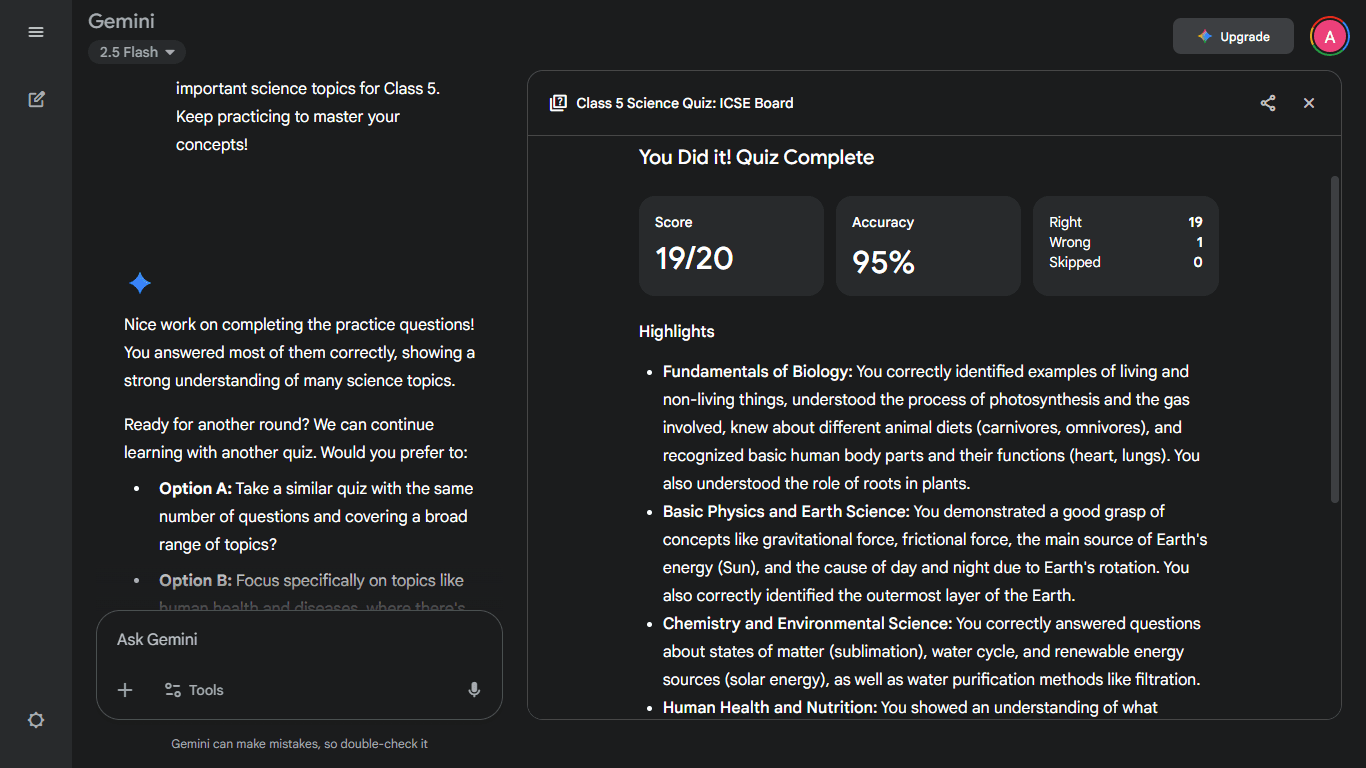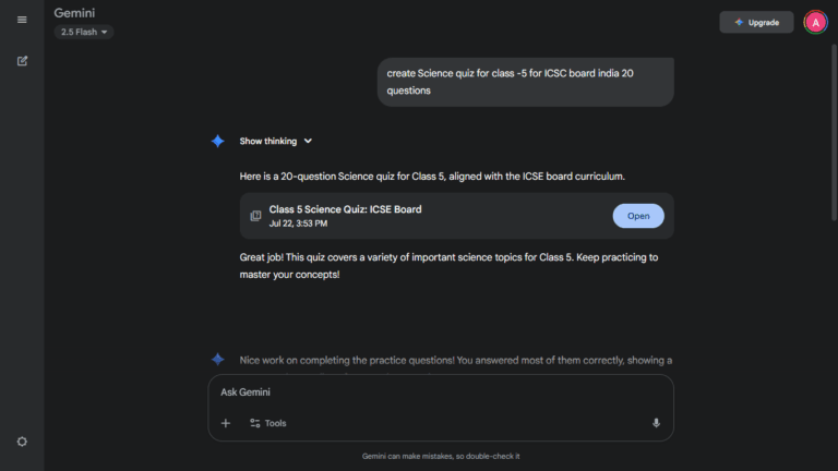 Recently, I tested Gemini AI to see how it works for Class 5 ICSE Board students. I wanted to create quizzes for subjects like Science, Maths, and Civics.