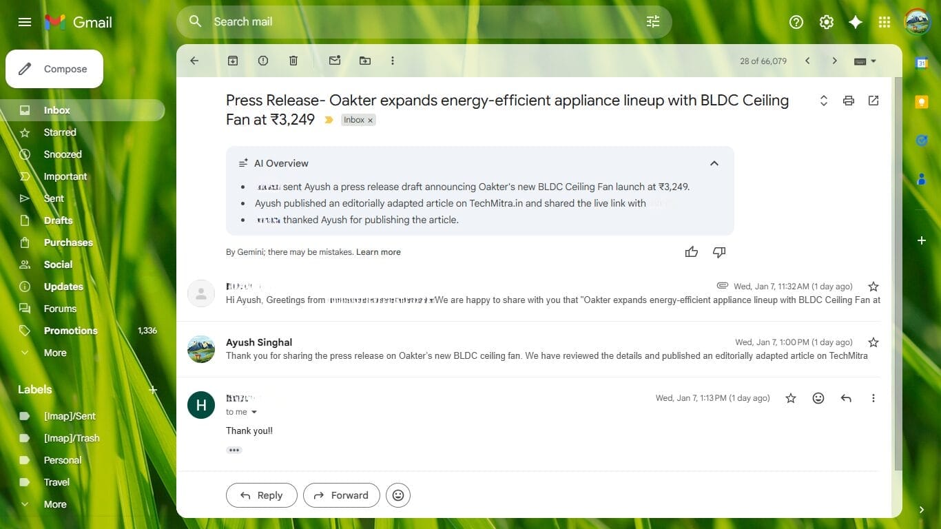 In my case, Gmail automatically summarized a press release conversation by clearly explaining:
