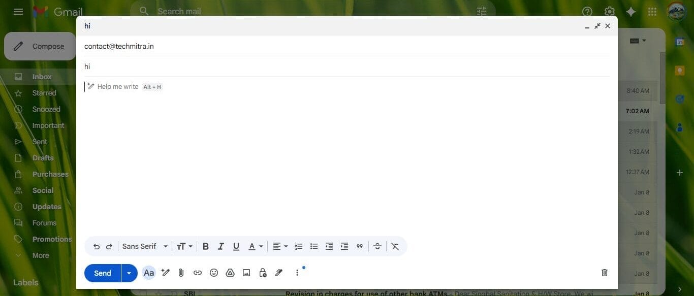 While composing a new message, Gmail now shows a “Help me write” option directly in the editor. With a single click, Gemini asks what you want to write and generates a complete draft based on your input.